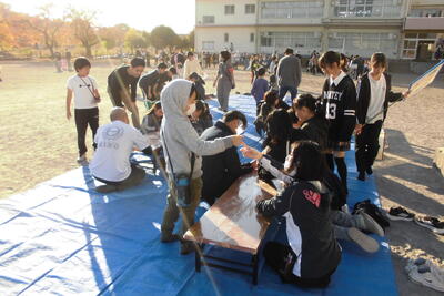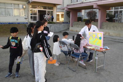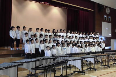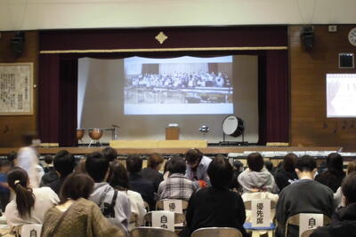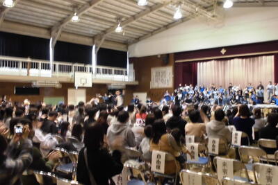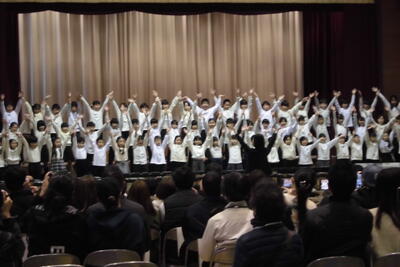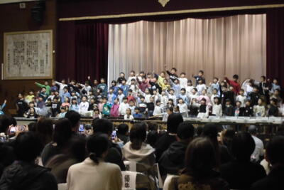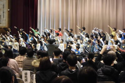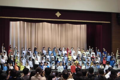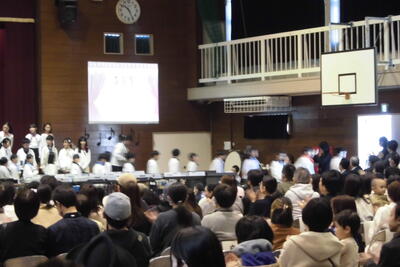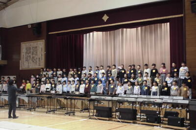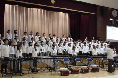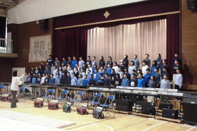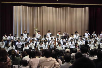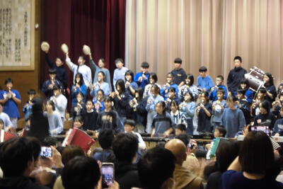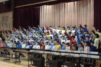 全校児童が体育館に集い、これまで練習を積み重ねてきた歌声と演奏を互いに鑑賞し合いました。
