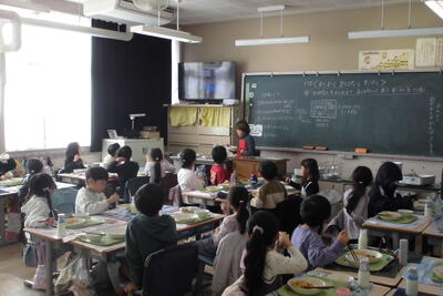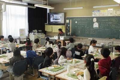 給食の時間に、潤徳小学校の皆さんが心をこめて作成してくださった「潤徳小学校紹介ムービー」を視聴しました。