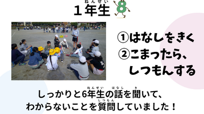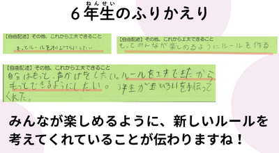 その一方で、各学年の役割についてはまだ意識しきれていない場面もあるので、回を重ねながら、自分たちのできそうなことを見付け、実践していく姿が見られることを期待しています。