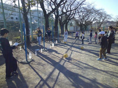 ボール蹴りでは、6年生がボールを蹴る子供の学年に応じて難易度を変えていました。利き足と反対の足で蹴ったり、的の位置を蹴る位置から話したりする工夫が見られました。