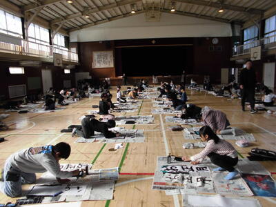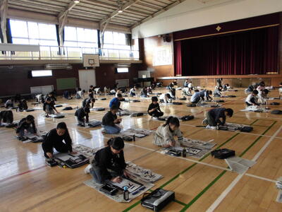 3学期のスタートと共に、3年生以上の学年ごとに校内書初めの会(席書会)を行っています。