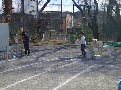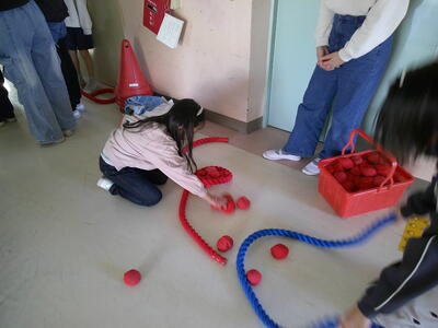 運び屋さんでは、縄を使って紅白玉を運ぶ遊び1年生が提案し、6年生がみんなに広めながら取り組んでいました。