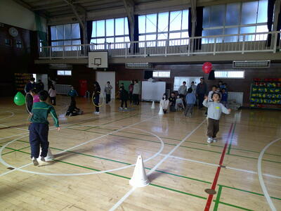 風船つきでは、風船が床に落ちないようにしながらリレーをする工夫が見られました。