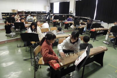 子供たちは、普段触れる機会の少ない箏の音色に興味をもちながら、一音ずつ真剣に弦を弾いていました。