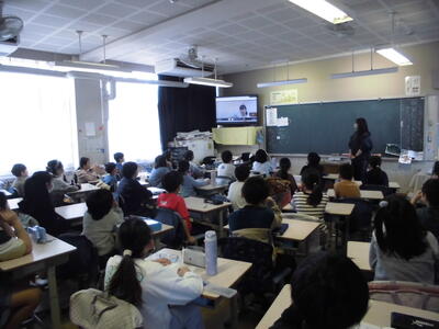 教室で、Meetを見ている子供たちも「すごい!」「かわいい!」などの声を上げながら、次々に紹介されるキャラクターたちを見守っています。