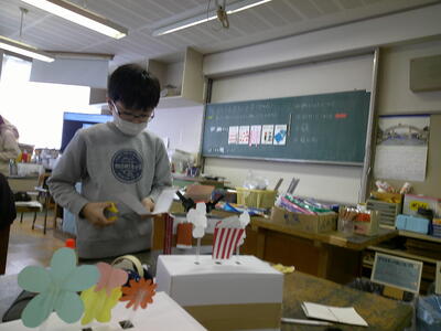 4月に活動計画を立てる際に、図工室を飾り付けたいという意見が出たため、毎月の活動の中で「ハッピーはちはちが住む町」をテーマに飾りをつくっていたそうです。立体的な飾りもあり、見応え抜群です。