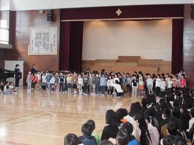 集会委員の皆さんが厳選した曲のイントロが流れるたびに、子供たちは真剣な表情で耳を傾けていました。