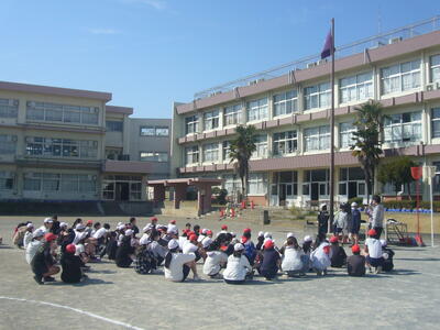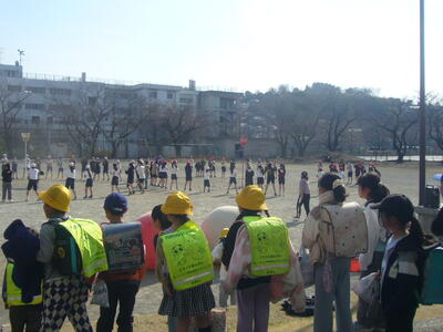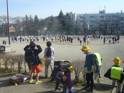 避難の約束である「お(おさない)・か(かけない)・し(しゃべらない)・も(もどらない)」をしっかりと守り、全員が素早く校庭へ集まることができました。