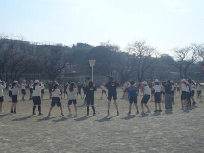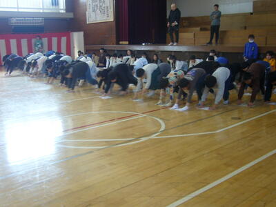 また、スローガン「心をもやせ 全力トライ」の振り付けを全員で確認し、得点方法の説明、優勝旗・準優勝杯の返還を行った後、全校でのラジオ体操で体をほぐしました。