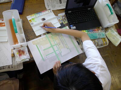 1年生は、空き箱や芯材を組み合わせて作品づくりをしました。