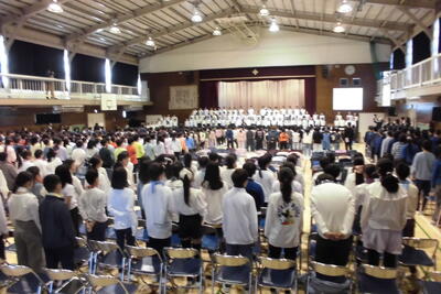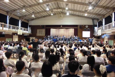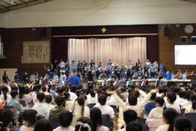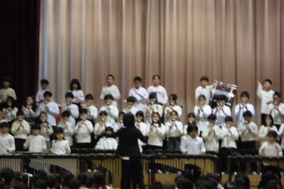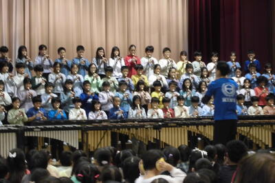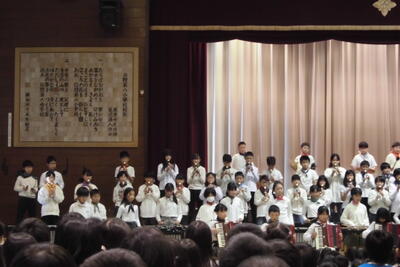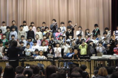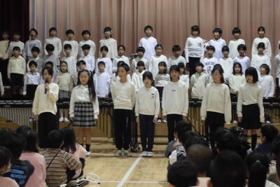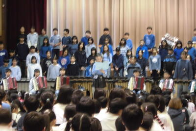 全校児童が体育館に集い、これまで練習を積み重ねてきた歌声と演奏を互いに鑑賞し合いました。