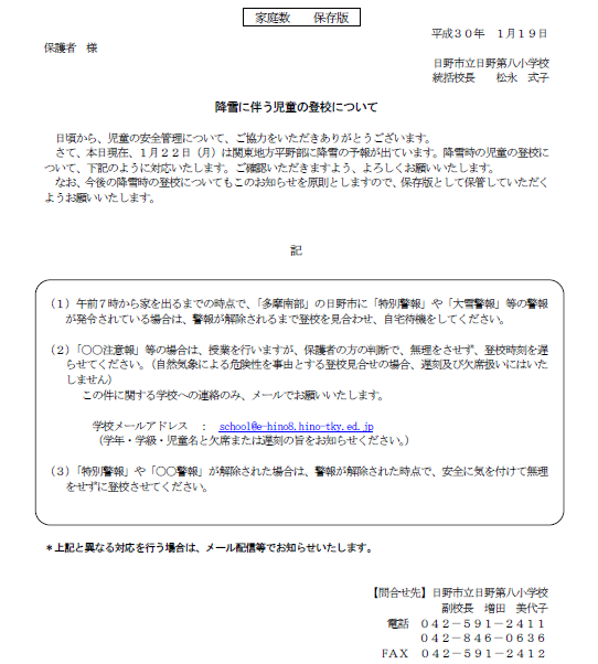 学校はお車でのご来校を原則禁止しております。また、近隣道路などへの駐車も絶対におやめください。自転車で来校される際は、必ず正門から入り、所定の位置に駐輪してください。北門付近への駐輪もおやめください。何卒よろしくお願いいたします。