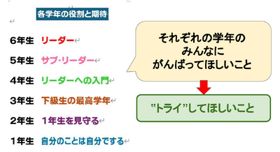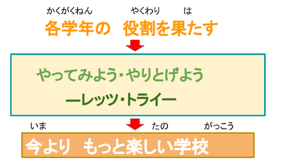 これらの「各学年の役割」を果たすことは、「トライ」することそのものです。そして、この役割を果たすことが、みんなの目標「やってみよう・やりとげようーレッツ・トライ!-」の実現に繋がります。そしてこのことが、本校の子供たちと教職員が共に目指す中期的な目標「今より もっと楽しい学校をつくる」の実現につながります。