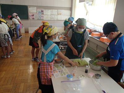 班で協力し野菜を切り、火の通りやすい野菜から炒めていきます。