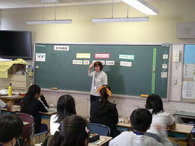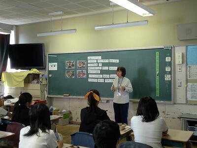 子供たちは、毎日食べている給食の献立が栄養バランスだけでなく、調理時間や価格、安全性等の様々なことに配慮しながら考えられていることを知り、興味をもちながら話を聞いている様子でした。