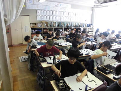 写真は、緊張した空気の中で毛筆に取り組む様子です。