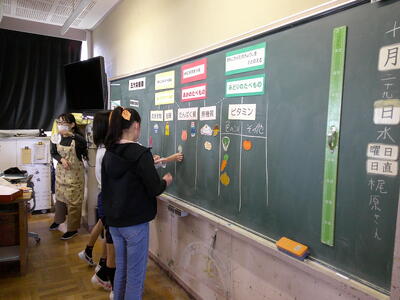 今日の給食に使われている食材を、それぞれの栄養素に分類するゲームをしたところ、片栗粉やごま、しいたけやたけのこの分類に悩みながら、友達と意見を出し合って活動をしていました。