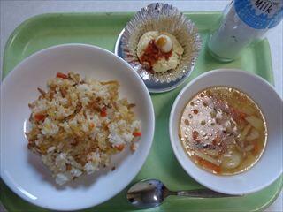 キムチチャーハン、エルシースコッチエッグ、春雨スープ、牛乳