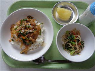 プルコギ丼、もやしと小松菜のナムル、りんごの缶詰、牛乳