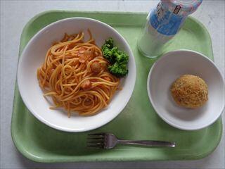スパゲティナポリタン、ゆでブロッコリー、アルファ米のライスコロッケ、牛乳