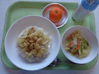 竹輪と大豆のバラ天丼、シャキシャキ野菜のそぼろ炒め、みかん、牛乳
