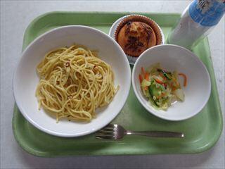 スパゲティペペロンチーノ、キャベツのレモン醤油、ブルーベリー入りカップケーキ、牛乳