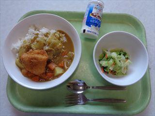 チキンカツカレー、ブロッコリーサラダ、ジョア