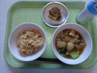 にんじんごはん、厚揚げのごまだれかけ、芋煮、牛乳