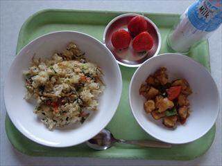 小松菜チャーハン、高野豆腐の酢豚風、いちご、牛乳