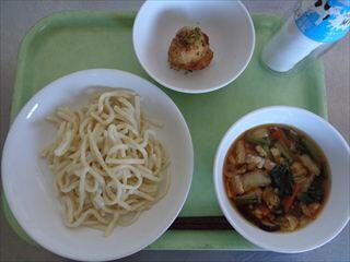 野菜ときのこのつけうどん、おみくじじゃが丸くん、牛乳