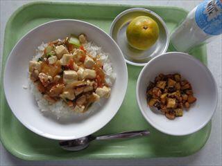 四川豆腐丼、大豆とさつま芋のカリカリ揚げ、みかん、牛乳