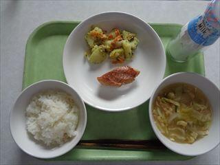 ごはん、赤魚の梅煮、じゃが芋の塩炒め、キャベツのみそ汁、牛乳