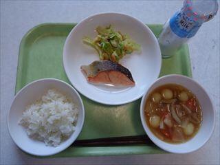 ごはん、鮭の塩こうじ焼き、野菜のゆずみそサラダ、芋団子汁、牛乳