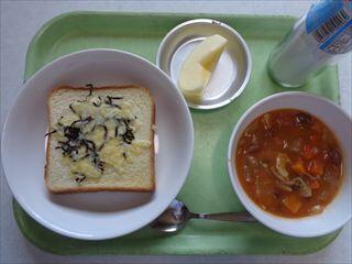 のりチーズトースト、チリコンカン、りんご、牛乳