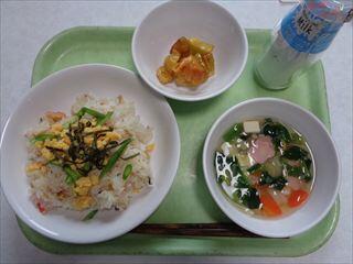 五目寿司、かまぼこ入りすまし汁、キャラメルポテト、牛乳