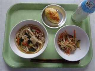 秋の香うどん、もやしときゅうりの辛子醤油、スイートポテト、牛乳