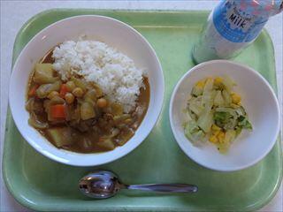 ひよこ豆のカレーライス、バジルサラダ、牛乳
