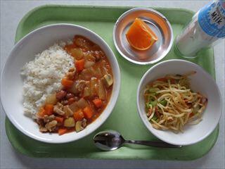 チリコンカンライス、じゃが芋のハニーサラダ、せとか(献立表にはありませんが追加メニューです)、牛乳