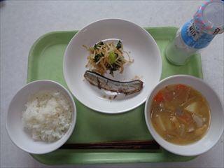ごはん、さんまの筒煮、もやしとチンゲン菜のお浸し、豚汁、牛乳