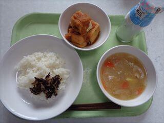 ごはん、レモンちりめんふりかけ、厚揚げのおろしかけ、さつま汁、牛乳