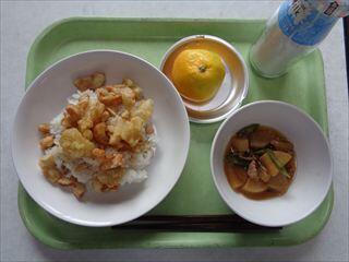 竹輪と大豆のバラ天丼、東光寺大根のべっこう煮、みかん、牛乳