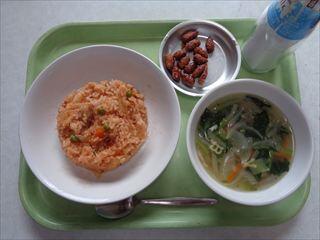 チキンライス、ABCスープ、キャラメルアーモンド、牛乳