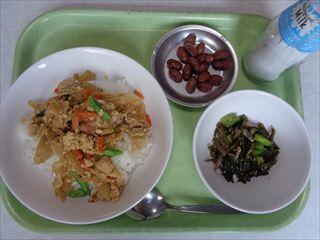 とよま丼、茎わかめと小松菜の醤油炒め、金時豆の甘煮、牛乳