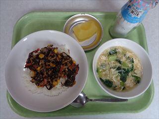 もずく丼、かきたま汁、りんご缶、牛乳