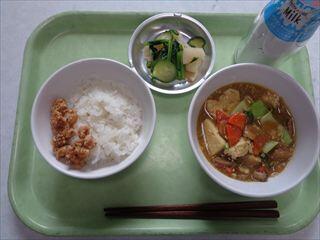 ごはん、大豆のみそがらめ、カレー肉豆腐、かぶのレモン酢和え、牛乳