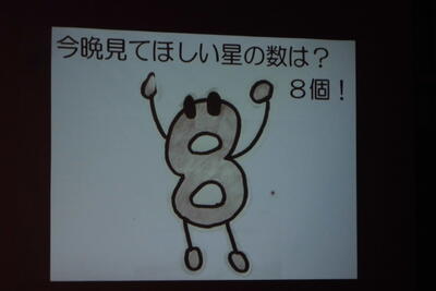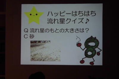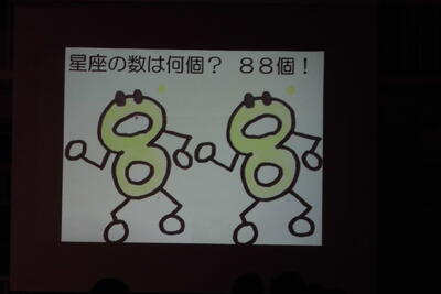 講演会では、本校オリジナルキャラクター「ハッピーはちはち」を登場させて、星座が88個あるというお話や、「日野八小」の「はち」にちなんで、「はちぶんぎ座(八分儀座)」という星座があること、「今日の観測会で8つの星座を見つけよう!」と紹介してくださるなど、子供たちの興味を惹きつける工夫が満載でした。
