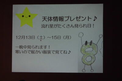 また、望遠鏡の仕組みや星空の基礎知識、クイズなども行われ、楽しく学びを深めることができました。