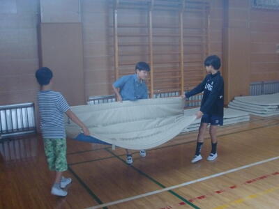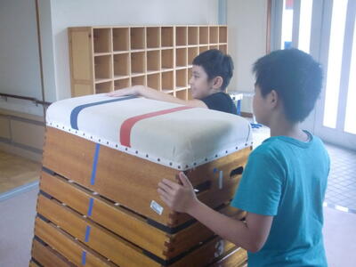 マットや跳び箱などの体育用具を元の場所に運びました。