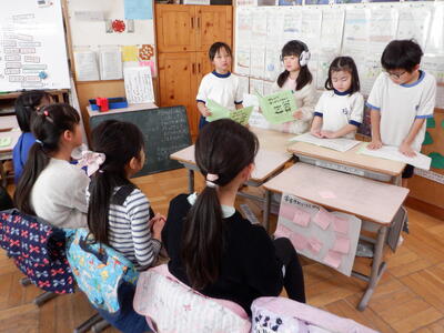 国語の授業「これは、なんでしょう」での学びを生かして、一年間で頑張ったこと・思い出は何でしょう?クイズをしながら頑張りを発表しました。ペアでのトークを聞いて、全校児童で答えは何かを考えました。入学式、幼稚園・保育園との交流、書初め、音楽会…