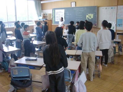 また今日の1,2校時には、5,6年生対象で陸上競技10種競技オリンピアンの右代啓祐さんによる陸上教室をおこなっています。本物のアスリートから走り方について学びます。よい機会をいただきありがたいです。